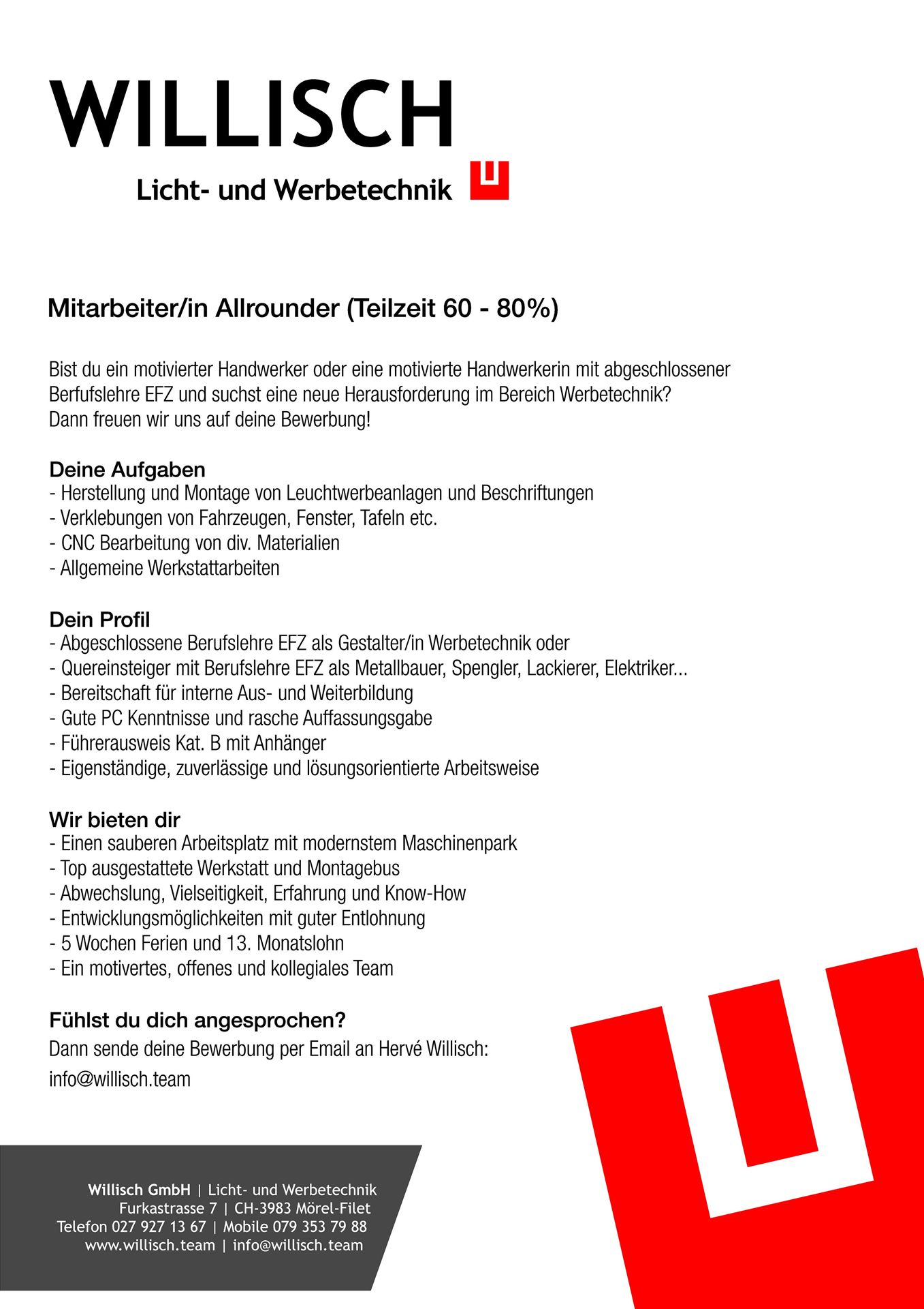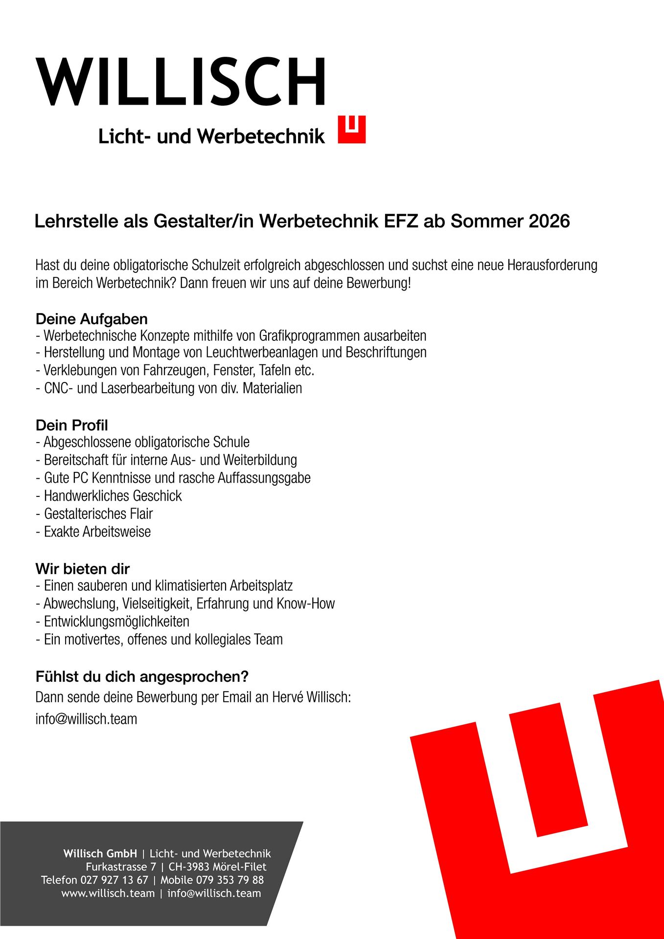 Hast du deine obligatorische Schulzeit erfolgreich abgeschlossen und suchst eine Lehrstelle im Bereich Werbetechnik? Dann freuen wir uns auf deine Bewerbung! Klicken Sie hier für das Inserat. Klicken Sie hier für mehr Informationen über die Lehrstelle und den Beruf als Werbetechniker.