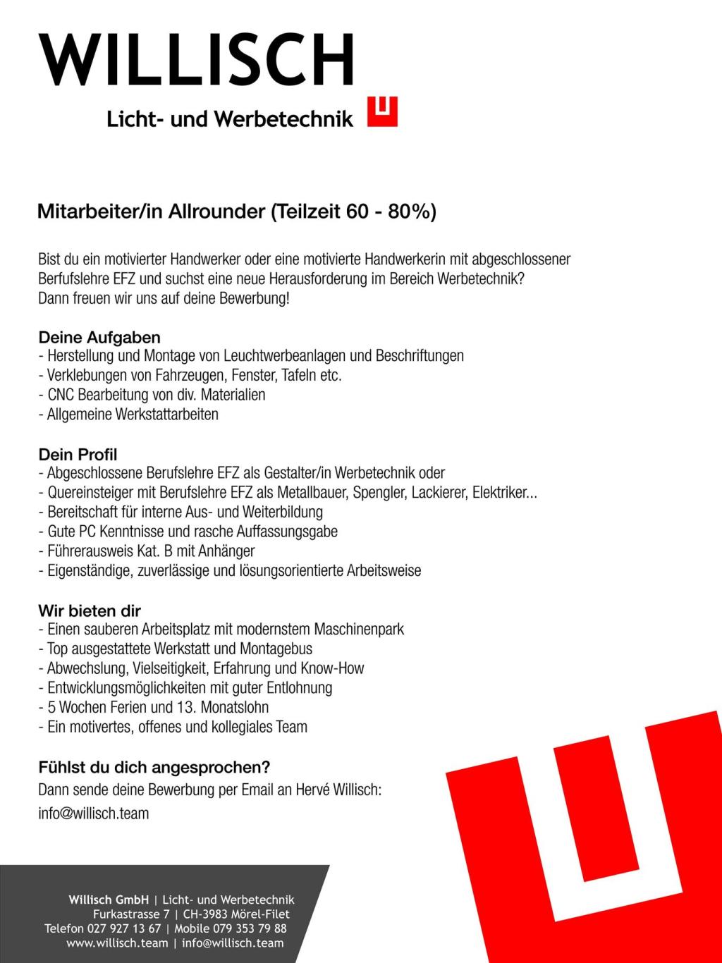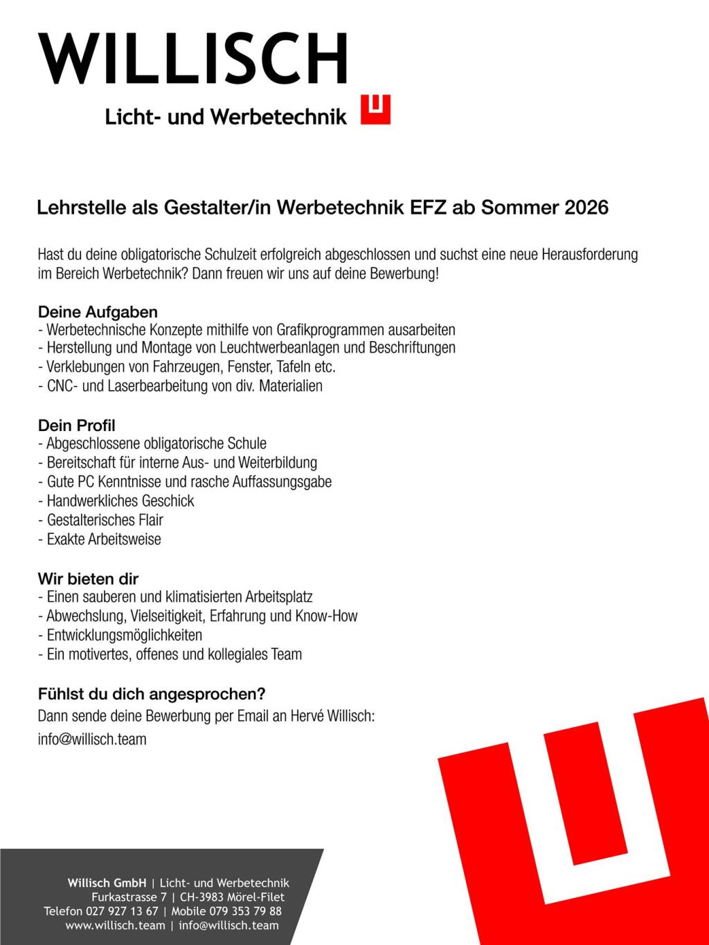 Hast du deine obligatorische Schulzeit erfolgreich abgeschlossen und suchst eine Lehrstelle im Bereich Werbetechnik? Dann freuen wir uns auf deine Bewerbung! Klicken Sie hier für das Inserat. Klicken Sie hier für mehr Informationen über die Lehrstelle und den Beruf als Werbetechniker.